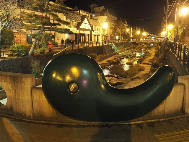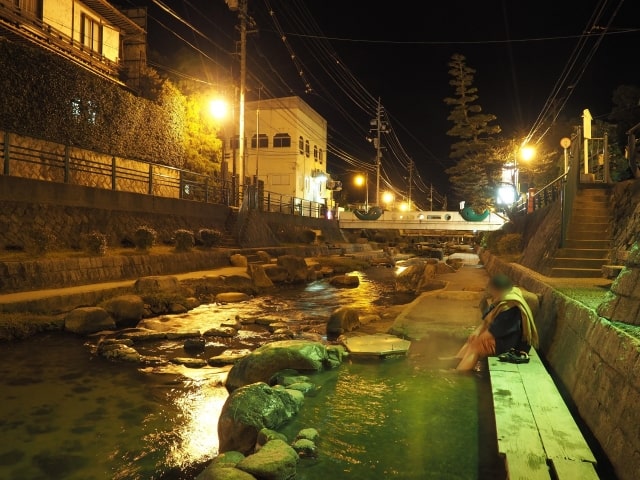 أما التجربة الأفضل على الإطلاق هنا، فهي الجلوس على ضفة النهر، حيث تتراص المقاعد الخشبية بمحاذاة العديد من أحواض الأقدام المجانية، لتتمكن من نقع قدميك في مياهها الساخنة. كما يعد ضفاف النهر، الذي ينير ليلًا بأضواء المصابيح، وجهة فريدة للتنزه بعد الاسترخاء طويلاً في حمام ساخن، وخاصةً في موسم تفتُّح أزهار الكرز.