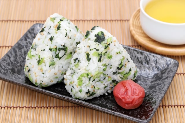 عند الانتهاء من تشكيل كرة الأرز بالشكل المرغوب، يتم تقديمها كما هي، أو يتم تغليفها بالأعشاب البحرية “النوري” كزينة وفي نفس الوقت لإضافة نكهة مميزة. وكما يتم تقديم المخللات اليابانية بجانبها مثل مخلل البرقوق كما في الصورة التالية.
