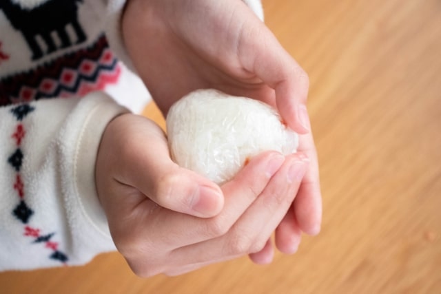 بعد طهي الأرز الياباني في الماء بدون إضافة شيء، يتم وضع كمية متوسطة منه على ورق سلوفان ويُرش عليه القليل من الملح الخشن، وبعدها يتم وضع الحشوة المرغوب بها في منتصف الأرز، ثم يتم تشكيل الأرز بالشكل المرغوب بالضغط عليه برفق وخفة حتى يصبح الشكل حاهزاً.