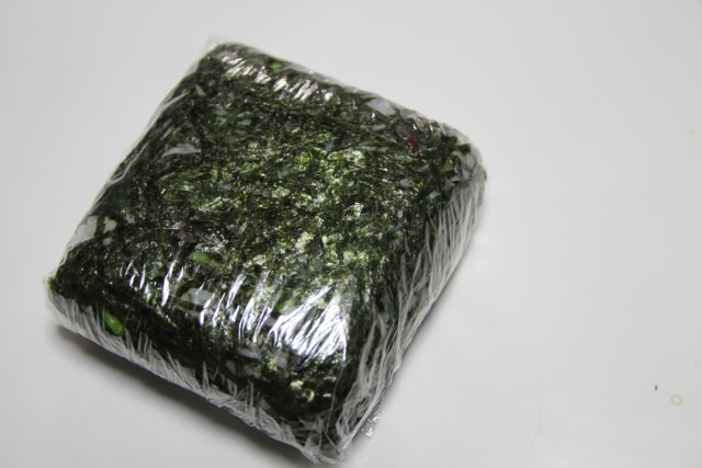 بعدها يتم وضع طبقة أرز أخرى رقيقة تغطي المكونات، ثم يتم تغليف الأرز والمكونات بقطعة النوري بالكامل باستعمال السلوفان لتسهيل تشكلها برفق على شكل مربع كما في الصورة التالية.