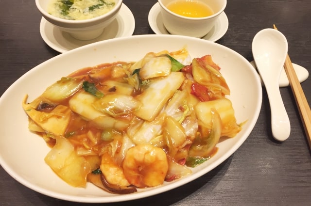 المكونات الجانبية: عبارة عن مزيج مقلي من الخضار والروبيان الصغير والقشور.