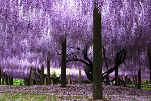 وعند رؤية هذه الأزهار المتدلية من أعلى كما في الصورة، ستشعرون وكأنكم في عالم خيالي تتدلى فيه الأزهار من السماء، وكثيراً ما يتم إظهار هذا المشهد في الأنمي الياباني، مثل الأنمي المشهور “قاتل الشياطين” حيث تمشي الشخصية تحت هذه الأزهار المتلألئة بلونها الزاهي.
