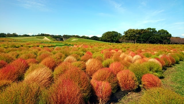 أما في الخريف تتلون النباتات إلى الألوان الدافئة، ومن أشهرها نباتات كوكيا التي يبدأ لونها بالتحول تدريجياً للأحمر فتكسي الحديقة بلونها الدافئ في مشهد جميل للغاية!