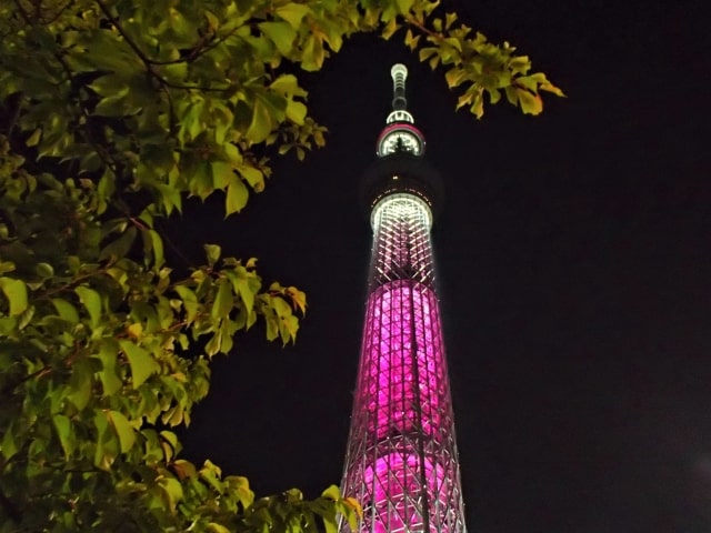 في الليل، استمتع بالإضاءة الجميلة تتميز بأناقة اللون البنفسجي إيدو، التي تلفت الانتباه مع ثوب القضبان الحديدية التي تلف بالبرج. أما اللون الأزرق الفاتح يعبر عن نهر “سوميدا”، حيث من الممكن أن تشعر بالقوة وبروح إيدو.