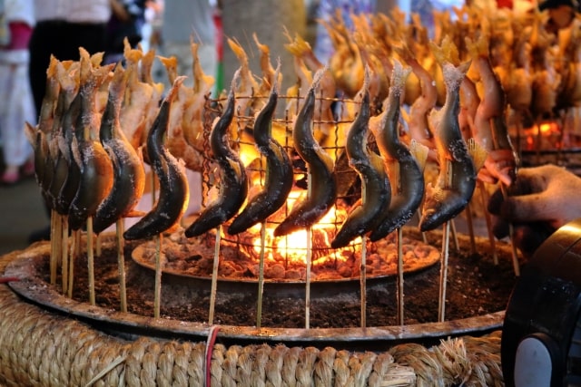 كما تشاهدون في الصورة التالية، نوع من أنواع السمك الحلو يتم فركه بالملح ويُغرس بأسياخ، ثم يتم وضعه بشكل دائري حول النار بطريقة تقليدية. ويسمى باليابانية “آينو شييو ياكي” أي السمك الحلو المشوي بالملح. وعادةً يُباع في مطاعم السمك وفي بعض الأكشاك. إنه لذيذ وطري وله طبقة مقرمشة.