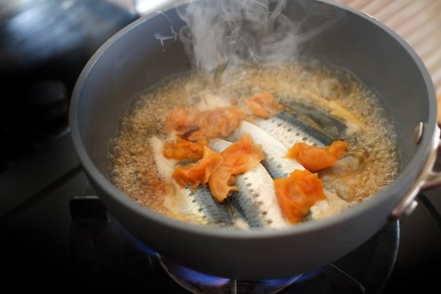 كما شاهدتم في الصورة السابقة سمك من نوع سريدين منقوع في الماء ولكن لا يغطيه. يُضاف بعض التوابل أو الخضراوات الأخرى أثناء سلق السمك اعتماداً على الطريقة والرغبة. ولكن يُرجى الانتباه عند تناول السمك المسلوق في اليابان، أحياناً يتم إضافة القليل من الساكي إلى صوص الصويا الذي يتم غلي السمك فيه، لذا كونوا حذرين من هذه النقطة.