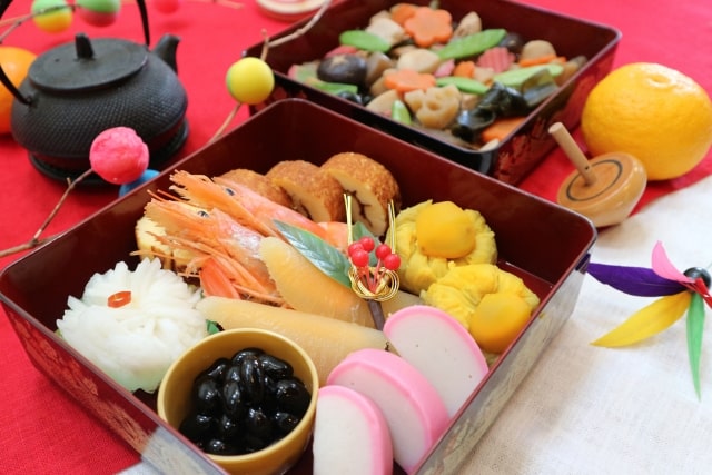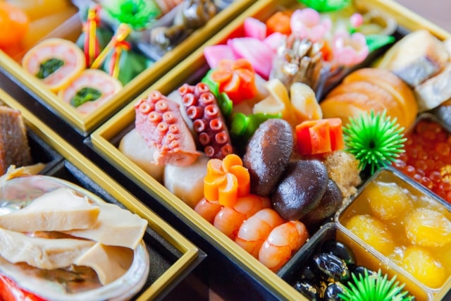 وتقليديًا ، هناك أطعمة معينة يتم تناولها أثناء الاحتفالات تسمى Osechi Ryori ، وقد تجد أن العديد من الأطباق أو المكونات هي في الواقع رمزية لشيء ما. على الرغم من أن بعض الأشياء قد تختلف باختلاف المكان في اليابان ، إلا أن هناك عمومًا الأطباق الرئيسية التي يتم الاستمتاع بها.