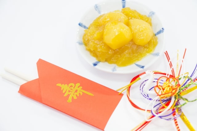 المعنى الأدبي لهذا الطبق هو “الكستناء الذهب المهروس” ، والذي يرمز إلى الثروة الاقتصادية . من المهم لوجبة رأس السنة الجديدة أن تجلب الحظ السعيد والازدهار. إذا قمت بإعداد هذا الطبق ، يرجى استخدام البطاطا الحلوة اليابانية بسبب لونها الأصفر المشرق. ليس فقط كونها أحلى من البطاطا الحلوة العادية ،لونها الأصفر هو أيضًا لون ميمون للعام الجديد.