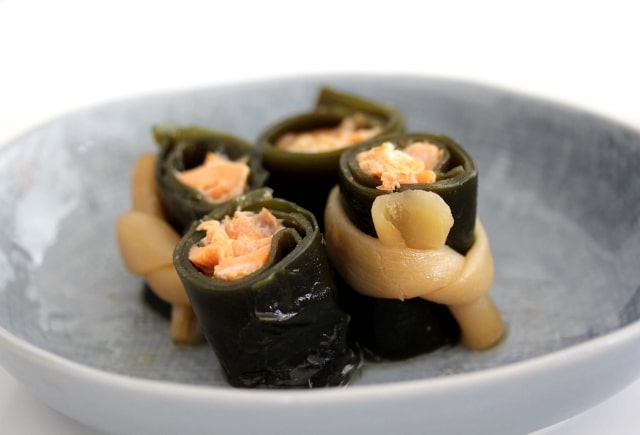 سمك السلمون اللذيذ ملفوف في كومبو ومربوط مع كانبيو (شرائح القرع) ، سلمون كومبو رول هو طبق ياباني تقليدي للعام الجديد. يمثل أسرار الشباب الدائم والعمر الطويل ، وقد تميل إلى التهام أكثر من واحد من هذه الأطباق الرائعة من المقبلات.