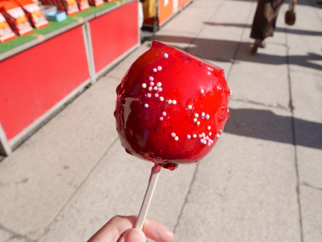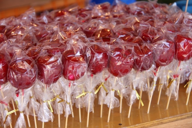 عند التفكير في المهرجانات اليابانية أول ما يتبادر إلى الذهن هو حلوى التفاح والمعروفة باسم “رينجو أمِ” في اللغة اليابانية. وتتميز حلوى التفاح بتلك الطبقة الحمراء اللامعة الدبقة التي تغلف التفاحة بالكامل، وتكون مزودة بعصا ليسهل حملها. وتتميز بطعمها الحلو والمقرمش المحبوب من قبل جميع الناس.