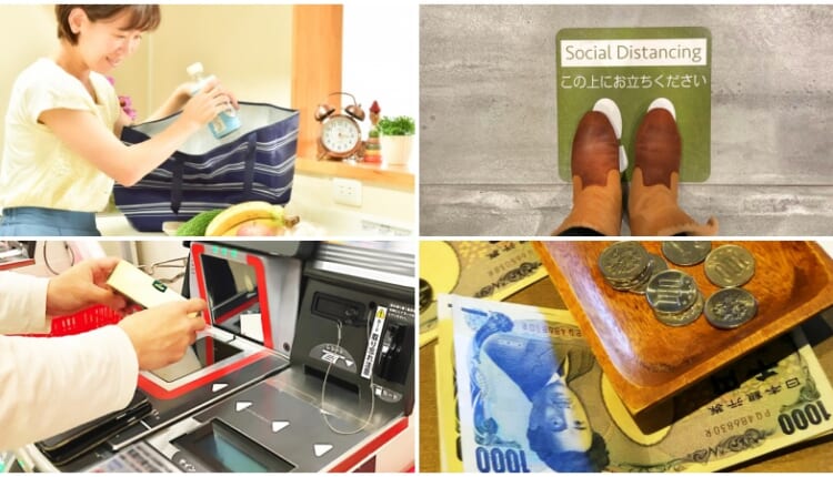 في جميع المتاجر اليابانية ستجد على الأرض الخطوط الخاصة بالزبائن للوقوف عليها قبل الوصول إلى الكاش للدفع مع ترك مسافة للزبائن الأخرى للتحرك في المتجر بدون إعاقتهم . قف هناك وانتظر خلف الزبون السابق لك .