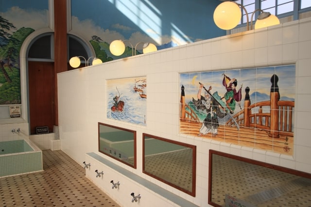 وغالباً ما تصور الرسومات على الجداريات جبل فوجي والسماء الزرقاء، حيث يشعر كل من يستحم كما لو أن المياه تغمره من جميع أنحاء الجبل وتنقي جسده. وأيضاً تتزين العديد من الحمامات بلوحات لأسماك الشبوط وهو يسبح، ولوحات تصور الناس قديماً في اليابان.